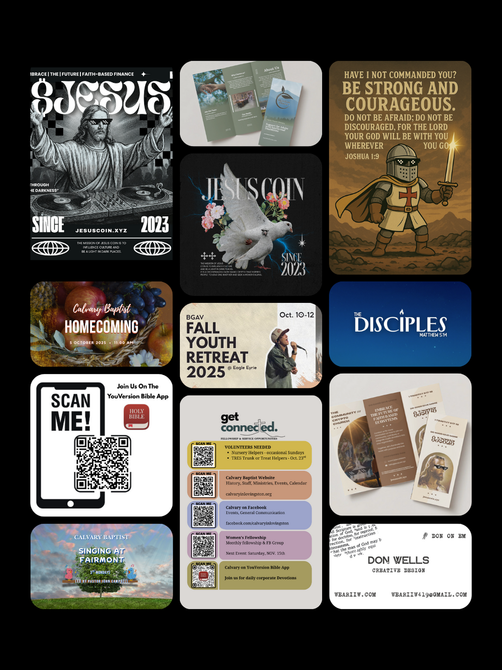 Through my studio, I help small businesses, churches and creatives bring their ideas to life with thoughtful, intentional design. Whether it's a website, a flyer or a full brand identity, my goal is to make your message clear and your vision seen.